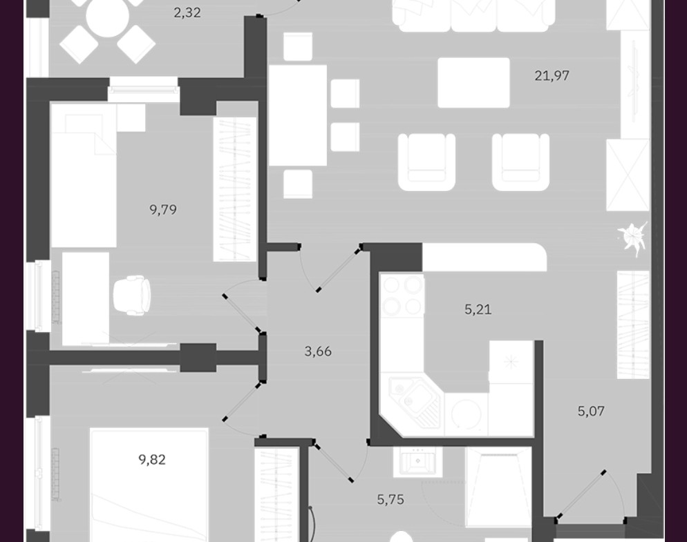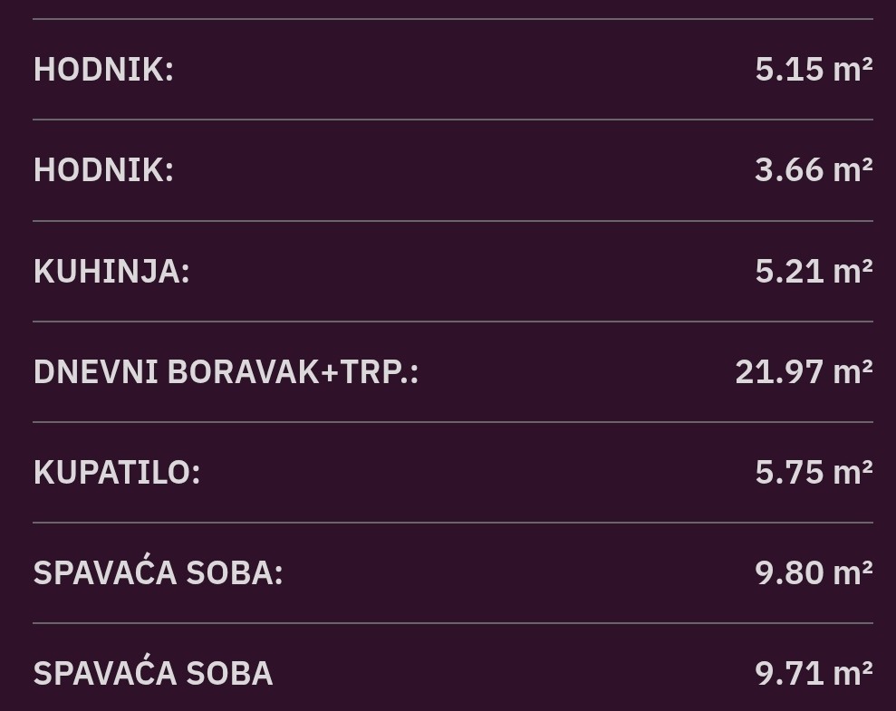 Stan se nalazi na četvrtom spratu, a zgrada će posjedovati lift. Po svojoj strukturi stan je trosoban i sastoji se od dnevnong boravka koji je u cjelini povezan sa trpezarijom i kuhinjom, dvije spavaće sobe, kupatila i terase.