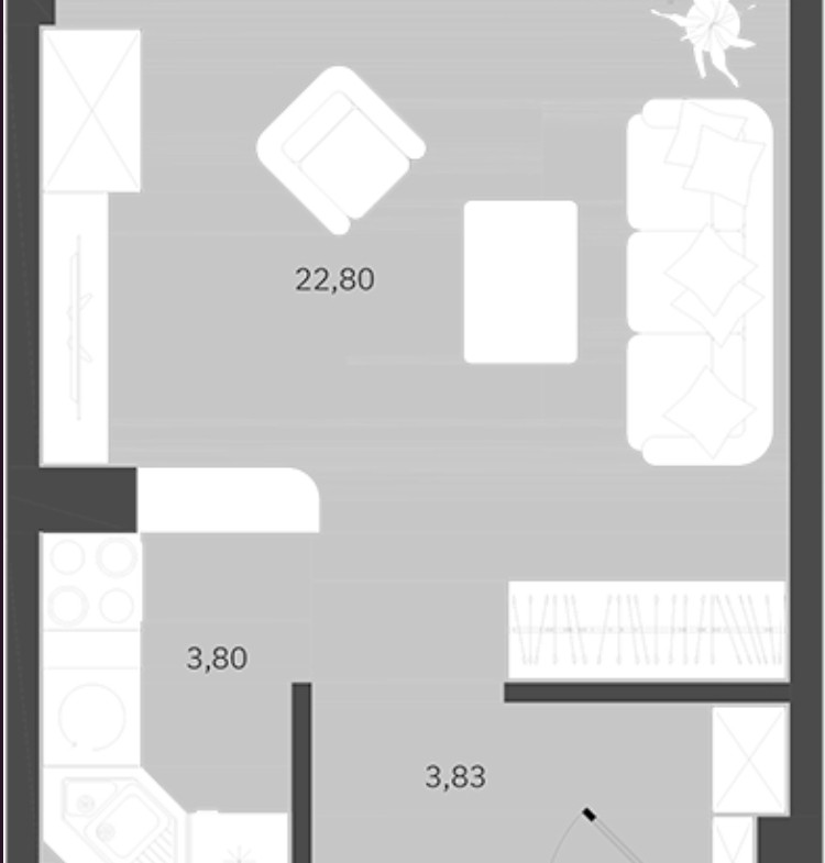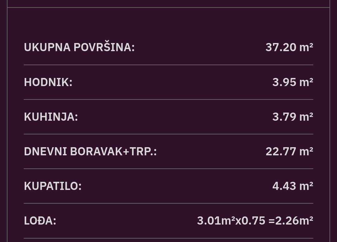 Stan se nalazi na prvom spratu, a zgrada će posjedovati lift. Po svojoj strukturi stan je garsonjera, ali još uvijek dok je u fazi igradnje moguće je izvršiti pregrađivanje i napraviti odvojenu spavaću sobu.