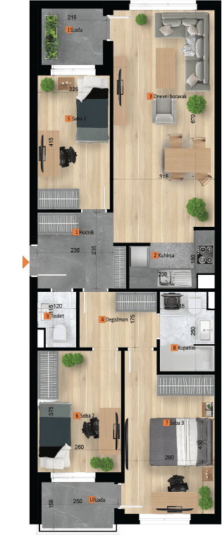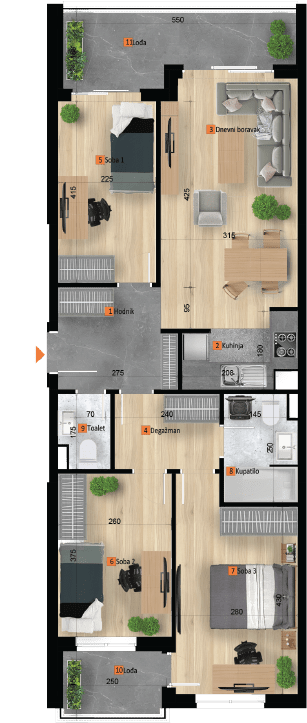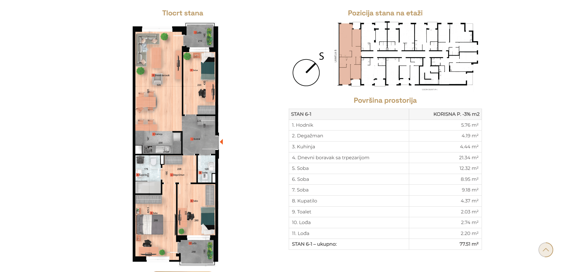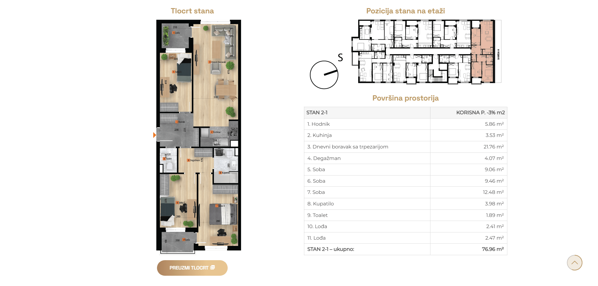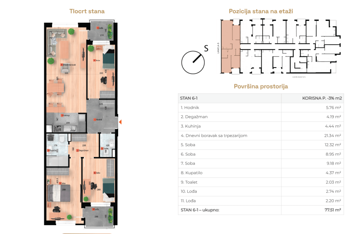 Stanovi se nalaze na različitim etažama od ukupno šest koliko će imati zgrada, dvije lamele A i B.
