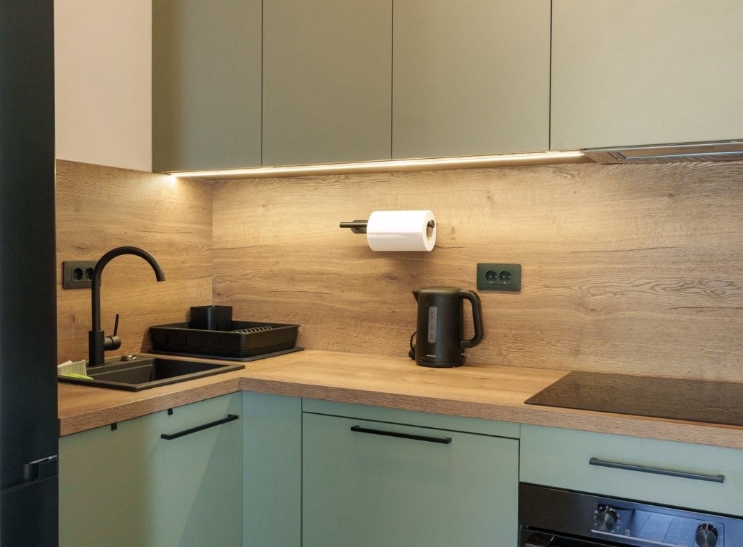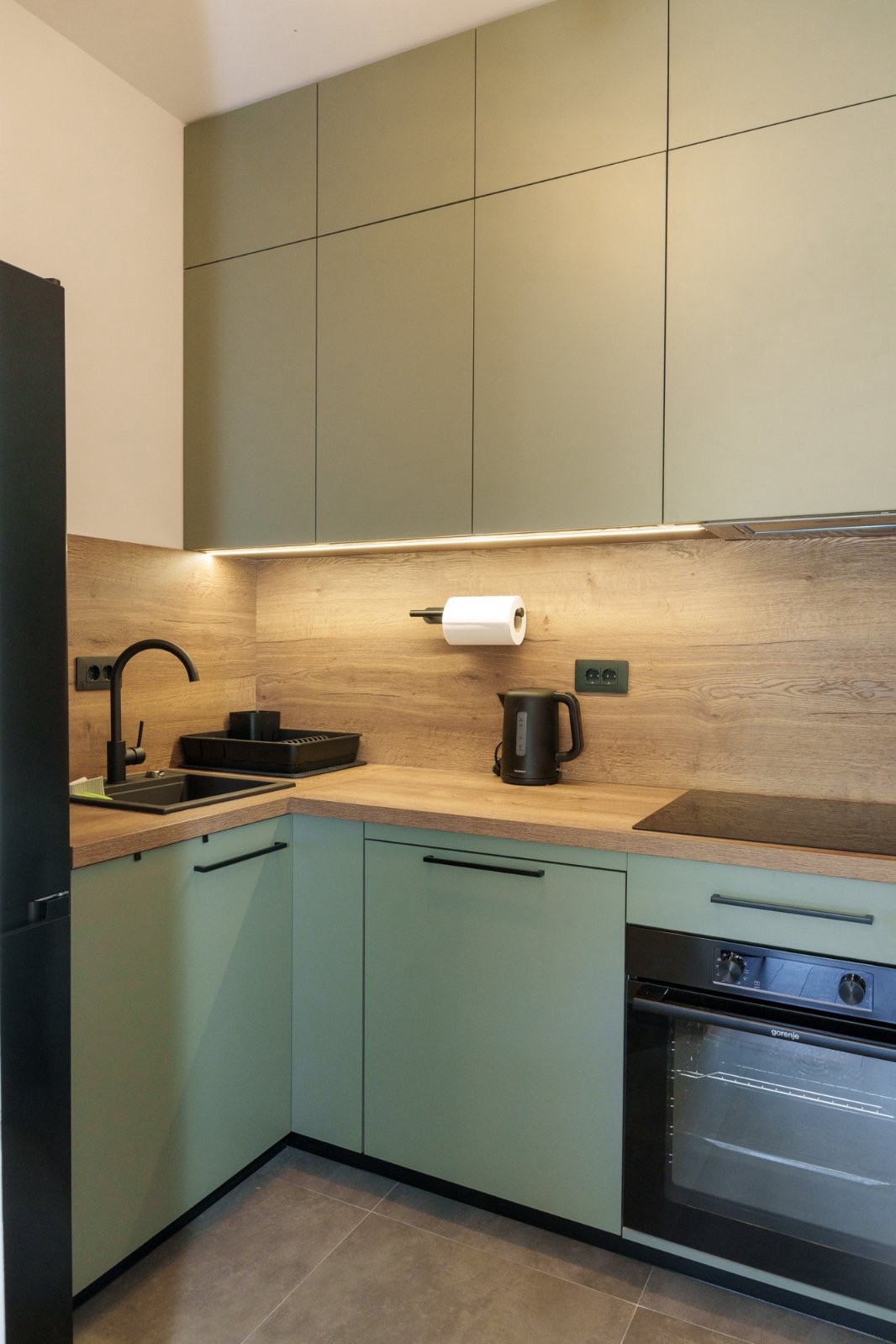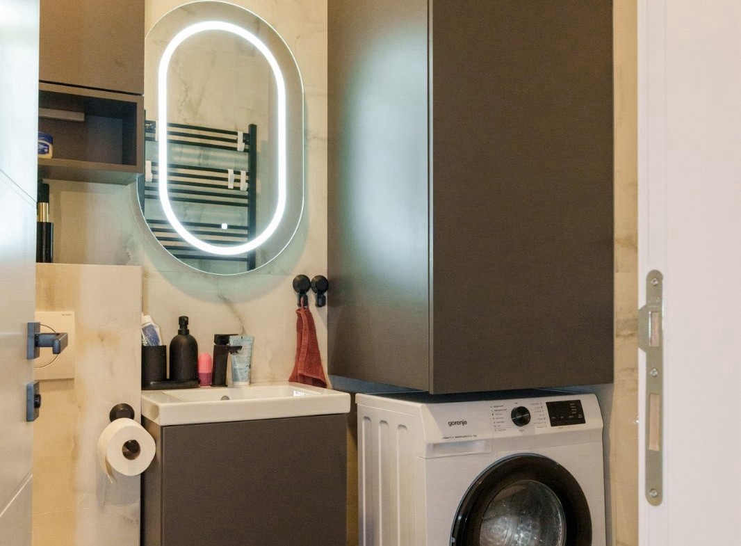 Kuhinja je u potpunosti opremljena sa kuhinjskim elementima, sudoper, frižider, šporet, mašina za suđe, napa.